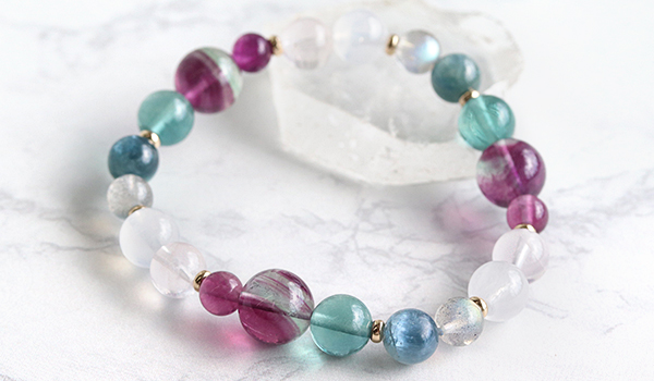 ブレスレットを手に取ると、ムーンストーンやラブラドライトのような淡いシラーが見えて、中には虹色もありました。