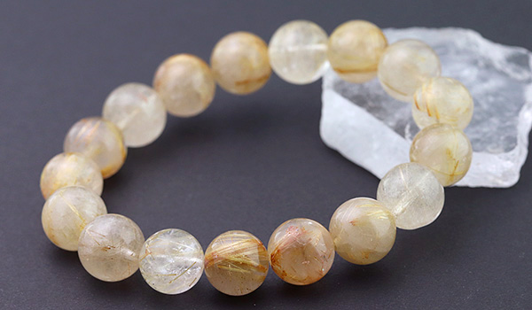 ブレスレットを手に取ると、ムーンストーンやラブラドライトのような淡いシラーが見えて、中には虹色もありました。